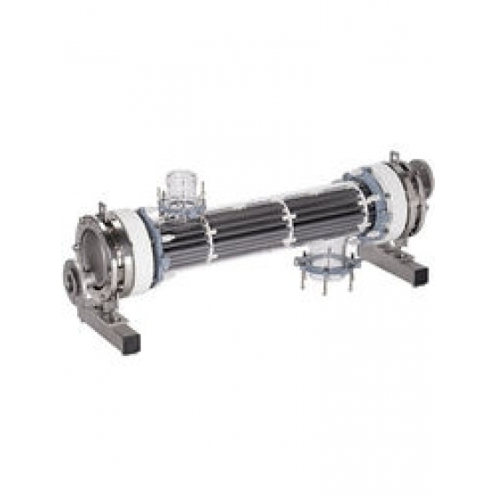 管殼式換熱器用於組合了填料精餾柱的較大系統上作為回流冷凝器。Buchi 提供 0.6 ~ 23 m2 熱交換面積的全玻璃管式換熱器和玻璃 / 碳化矽 (SiC) 熱交換器。SiC 換熱器具有優良的熱傳導性,對整個系統而言,與全玻璃類型換熱器相比減少了要求的熱交面積,減少佔用的空間。其安全腔更容易洩漏檢驗,且冷卻介質的操作壓力增加到6bar。