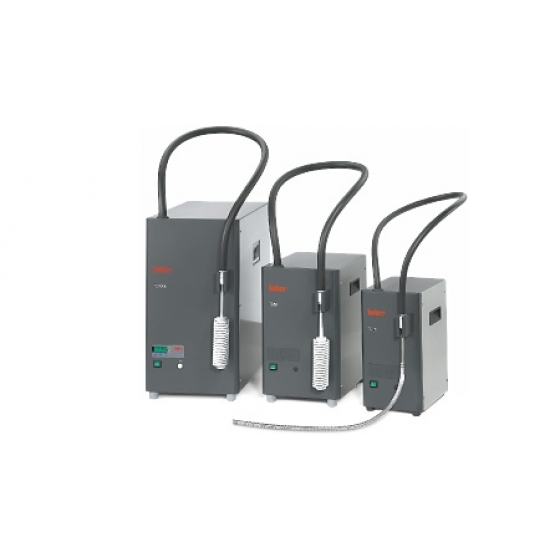 Immersion Coolers offers a flexible solution for a variety of cooling applications. These units are easy to use and ideally suited to quick liquid cooling. A typical application is to cool heating thermostats or as a substitute for dry ice. Immersion coolers offer an environmentally friendly cooling alternative by reducing consumption of tap water. The TC Immersion Coolers are available without a controller for continuous cooling or respectively with controller and Pt100 sensor. Models with the addition “E” are equipped with a temperature controller and LED Display and have a temperature stability of ±0.5 K. All models can be delivered with a flexible evaporator coil (no extra cost). The model name and number of these units have the suffix ”F“. Small footprints combined with compact housing made from high quality stainless steel and carrying handles allow the Immersion coolers to be easily positioned for use and, for easy relocation, trolleys are available as accessory.